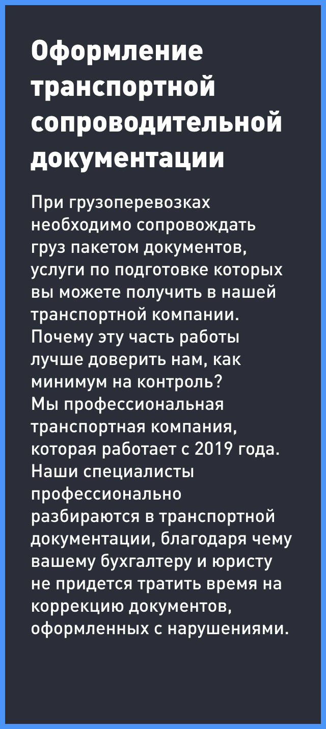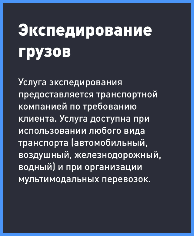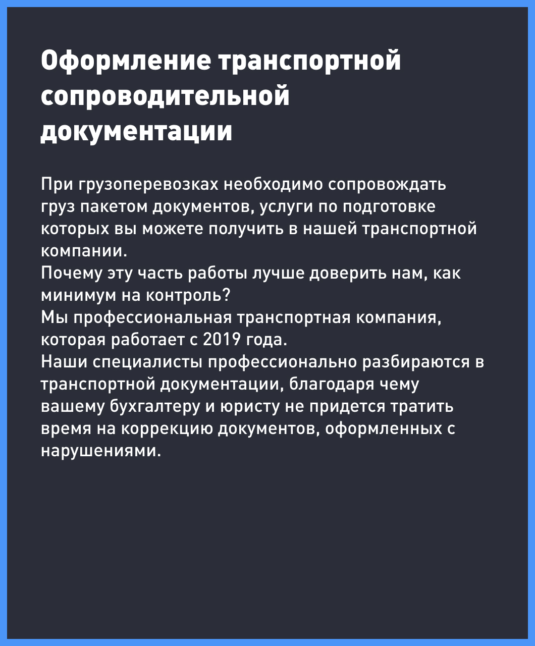 Для каждого груза подбирается специализированный транспорт, разрабатывается маршрут, позволяющий доставить груз до места назначения.