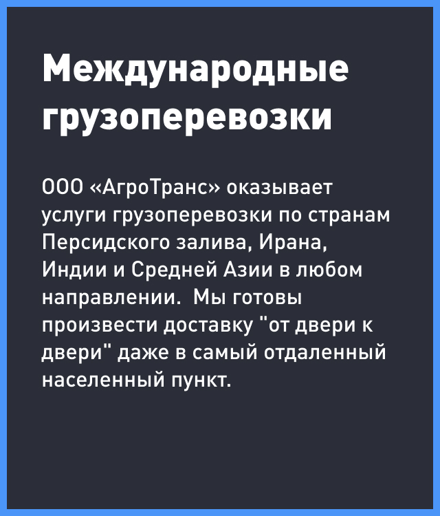 Обращаясь в ООО «АгроТранс», вы можете быть уверены в высоком качестве сервиса, безусловном контроле специалистами надлежащего исполнения заказа на каждом этапе транспортировки, точном соблюдении сроков и безопасности груза.