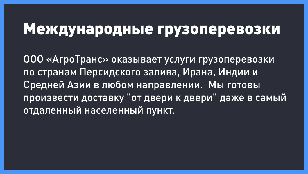 Транспортная компания ООО "АгроТранс" предлагает услуги по международным перевозкам и дополнительный сервис, который облегчает торговым и производственным фирмам России коммуникации с партнерами.